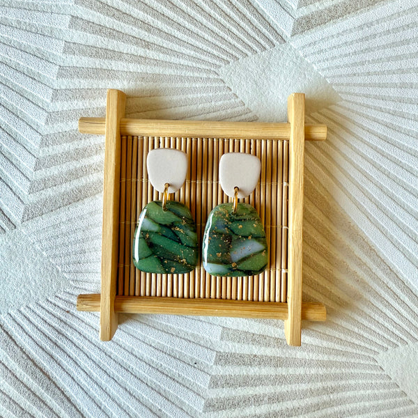 Jolie paire de boucles d'oreilles composée de deux éléments. La pièce du haut est rosé mate. Celle du bas a des motifs fleuri (motifs aléatoires) avec une finition glossy.
