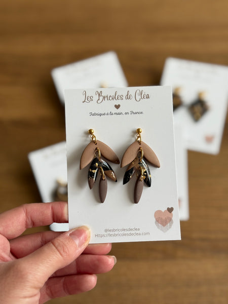 Élancées et poétiques, ces boucles d’oreilles sont articulées en 3 pièces mates et résinées.