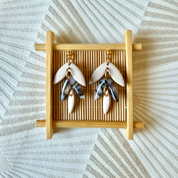 Jolie paire de boucles d'oreilles composée de trois éléments aux tons verts.
