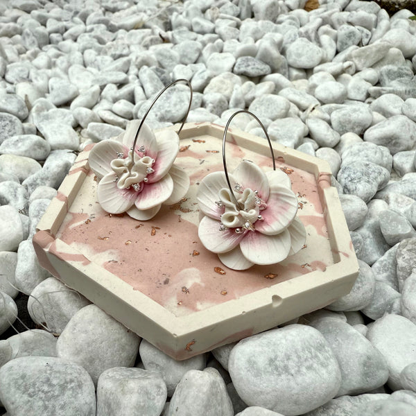 Jolie paire de boucles d'oreilles fleurs. Couleur blanche légèrement pailleté selon la lumière. L'intérieur de la fleur est doré avec des petits strass. (ou argenté selon les finitions que vous choisirez). La fleur est montée sur une créole dorée ou argentée. Idéales à porter en période estivale, cette paire de boucles d'oreilles vous enivra par sa beauté et se portera à merveille avec une multitude de couleurs différentes.