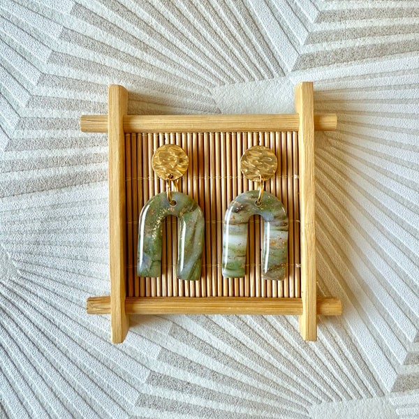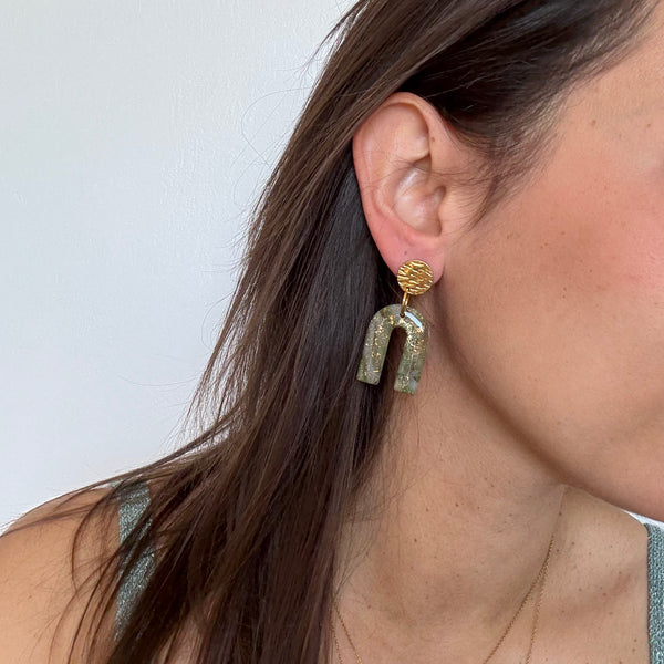 Jolie paire de boucles d'oreilles composée d’un élément principal en forme d’arche, de U à l’envers pour laquelle une couche de résine a été appliquée. Sur le haut de la boucle d’oreille se trouve une pièce ronde martelée dorée. Celles ci étant rappelée sur le bas de la boucle d'oreilles par les pampilles du même style.