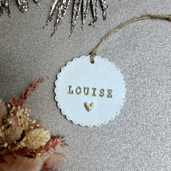 Médaillon en argile auto durcissante personnalisable avec un prénom. (8 lettres maxi). Sur le bas du médaillon se trouve un petit cœur pailleté en relief.