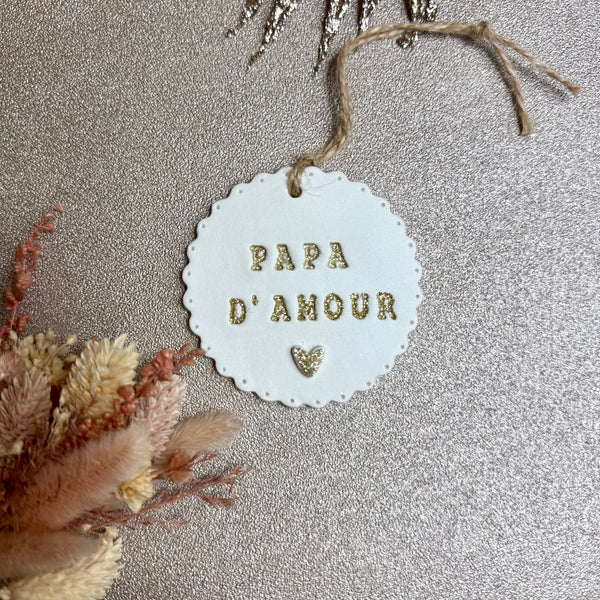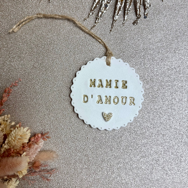 Médaillon en argile auto durcissante décoré d’un petit cœur pailleté en relief.